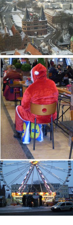 En afdeling af julemarkedet lå lidt for sig selv et stykke ude af An der Obertrave, hvor der mellem store hvide telte var legehuse og for enden var anlagt en skøjtebane. Vi fortsatte ad An der Obertrave til et hjørne med en bro, som guidbogen havde fremhævet for stedets tilnavn, Malerwinkel – et godt sted at tage et flot billede af byen. Det er godt med den slags tip, for Lübeck er en udfordring for alle os, der ser vores rejsemål via digitalkameraets skærm og håber at kunne tage et snap shot, der kan matche guidebogens illustrationer. For på trods af de mange kamtakkede gavle, flotte kirker, bygninger tilbage fra 1200- og 1300-tallet og prangende lavsbygninger, så er byen ikke særlig fotogen. De små gader er proppet med parkerede biler, den bedste udsigt til Maria kirken får man fra bagerste vindue i legetøjsafdelingen på fjerde sal i varehuset Karstadt, og middelalder-rådhuset har fået en renæssancefacade, der ligner et glasurlag fra et kageslot. Men nu er det jo ikke altid det ydre der tæller, så vi gik ned i rådhuskælderens middelalderrestaurant og fik en traditionel tysk middag – og skam for dem, der forlader en tysk by uden at have spist kål med et udvalg af pølser og et stort krus fadøl i en eller anden kælderrestaurant.