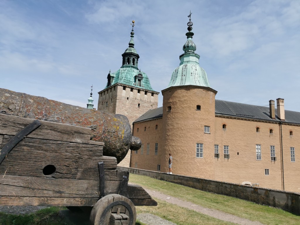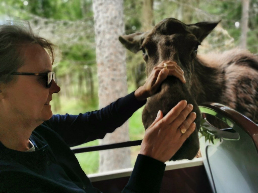 Og hvis man vil have flere borge – og det vil vi gerne – er der på Öland den royale sommerresidens Solliden og middelalderborgen Borgholm. Og på hjemvejen kan man besøge renæssanceslottet i Kalmar og overnatte i Älmholt, hvor Ikea holder hof og har en udstilling, der er mere interessant, end man skulle tro. På vej hjemover fra Älmhult kørte vi af motorvejen og tog lidt impulsivt på en elgsafari i Småland – Markaryd Elgsafari. Og Astrid – den ledende elg i parken – kiggede indenfor i vognen for at hilse på min kæreste, og de andre i vognen